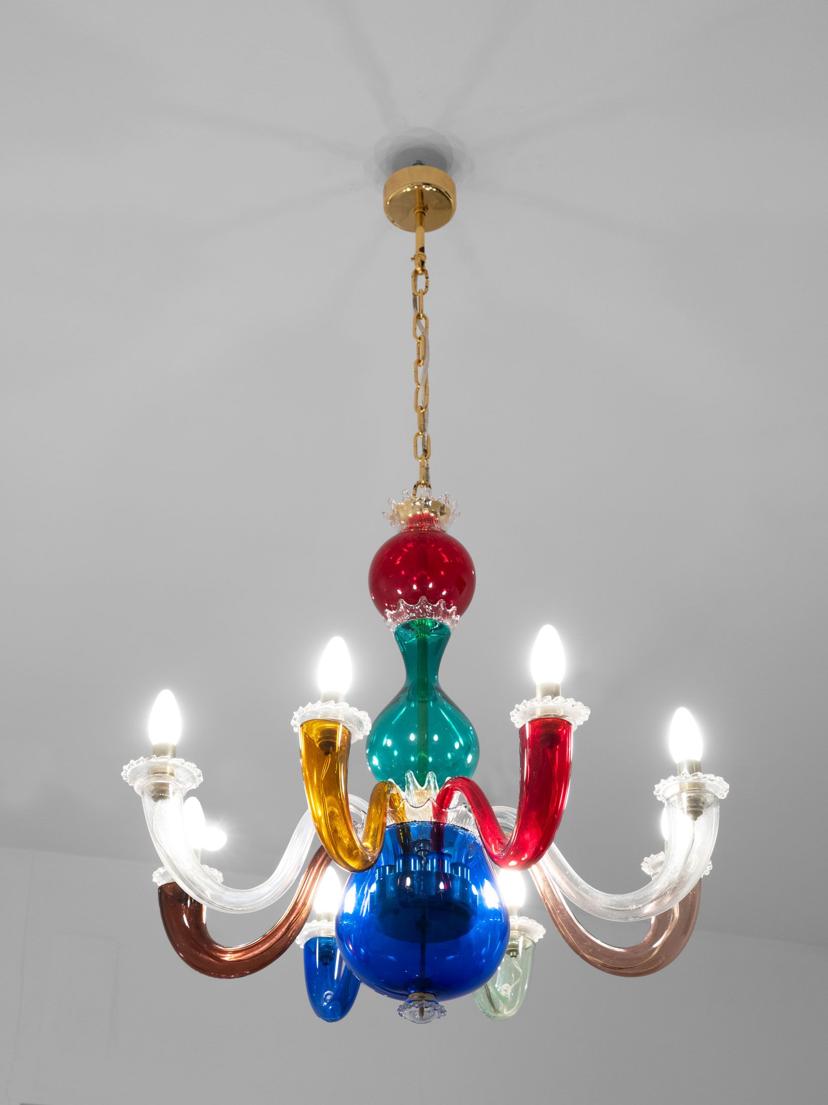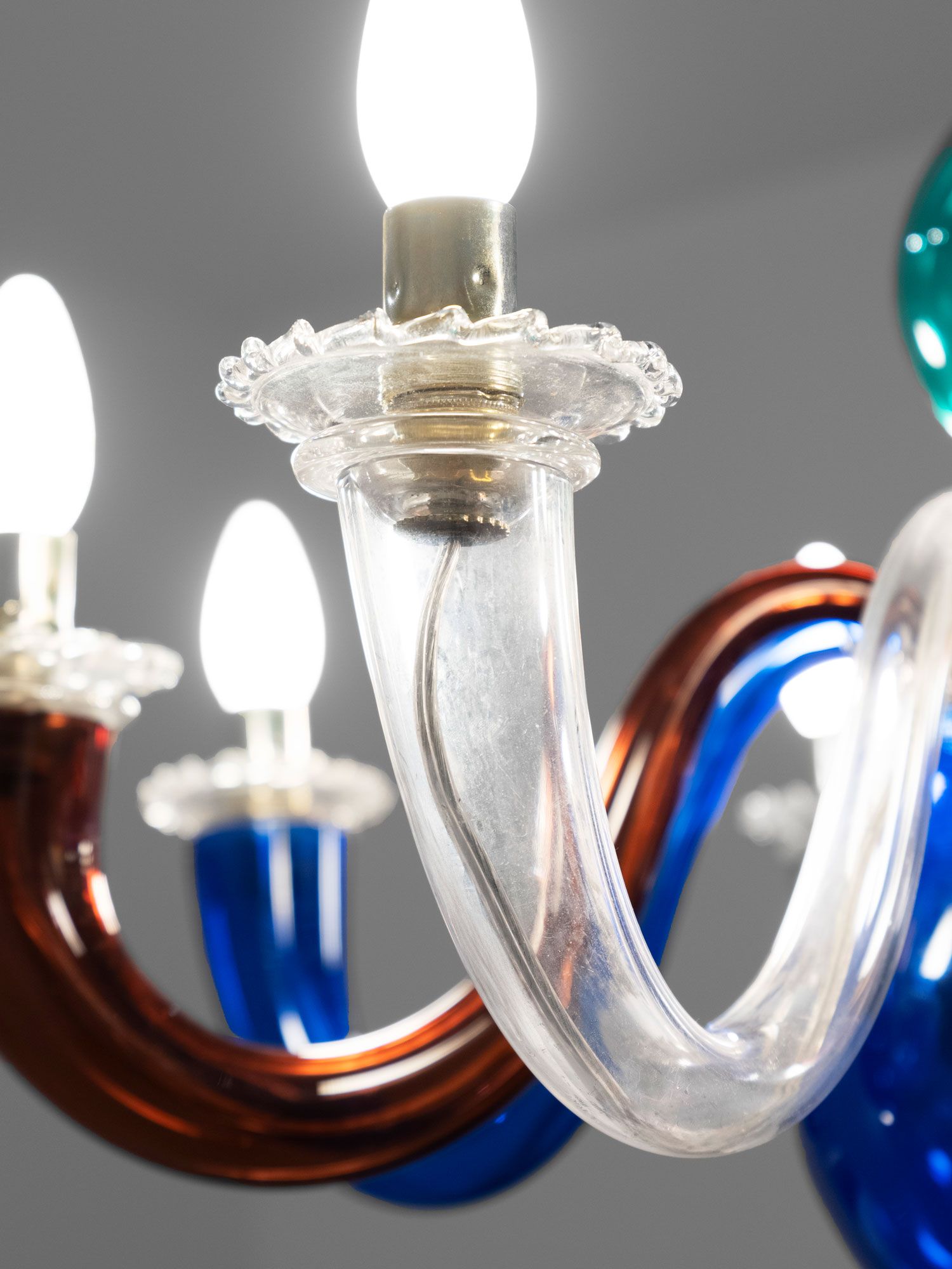 The glass is mouth-blown and hand-crafted in traditional Venetian colors, combining transparent and colored glass. In this chandelier, clean lines are paired with vibrant colors.