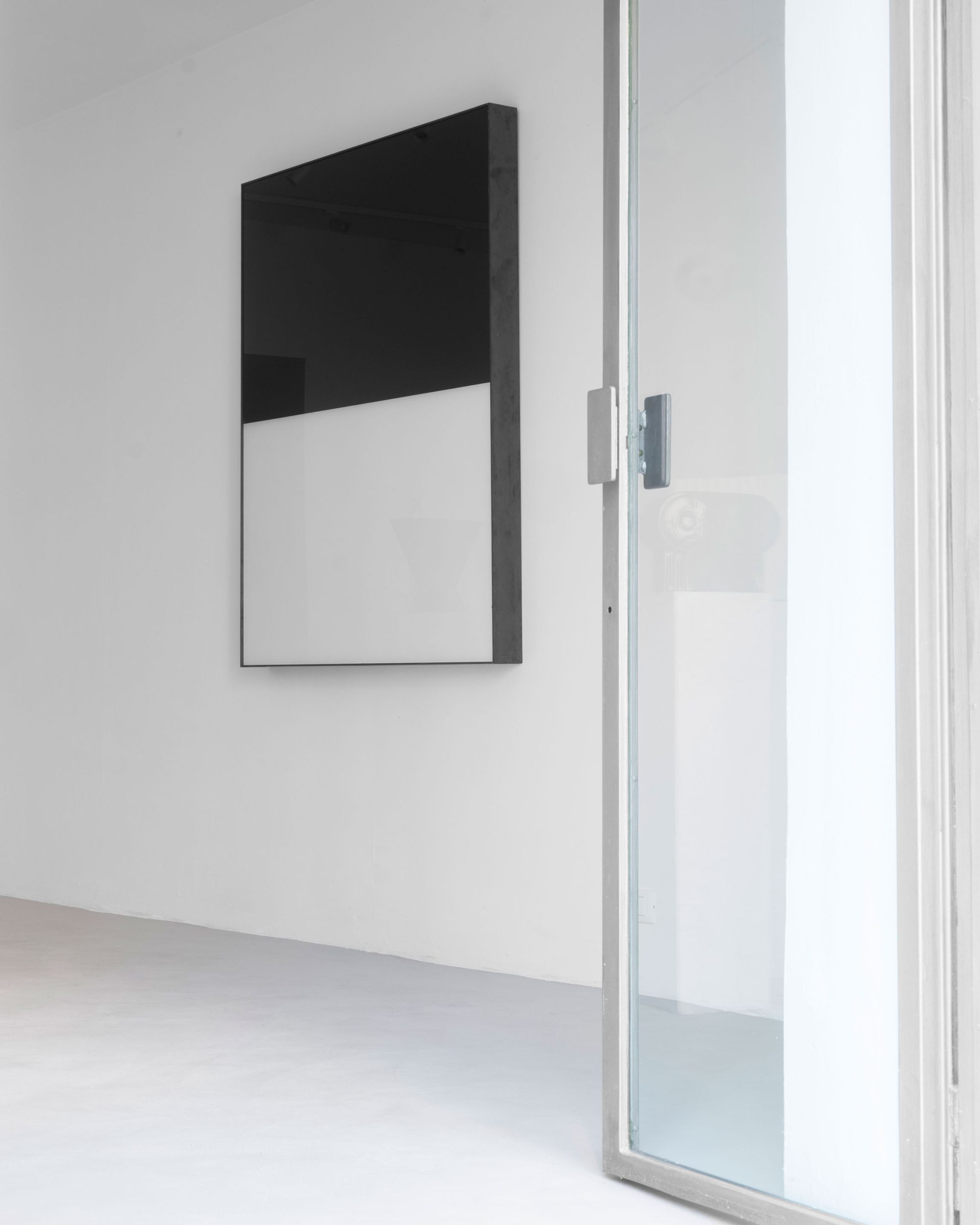 The artwork was created with white and black enamel on a sheet of glass, and the frame is made of iron.