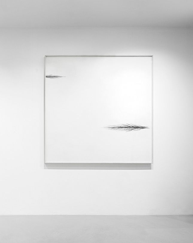 A work created using mixed media (drawing, graphite, black and blue pencil, ink and egg tempera on plywood). The theme of the tree returns: two cypresses that obey laws different from those of nature, suspended in an empty space.